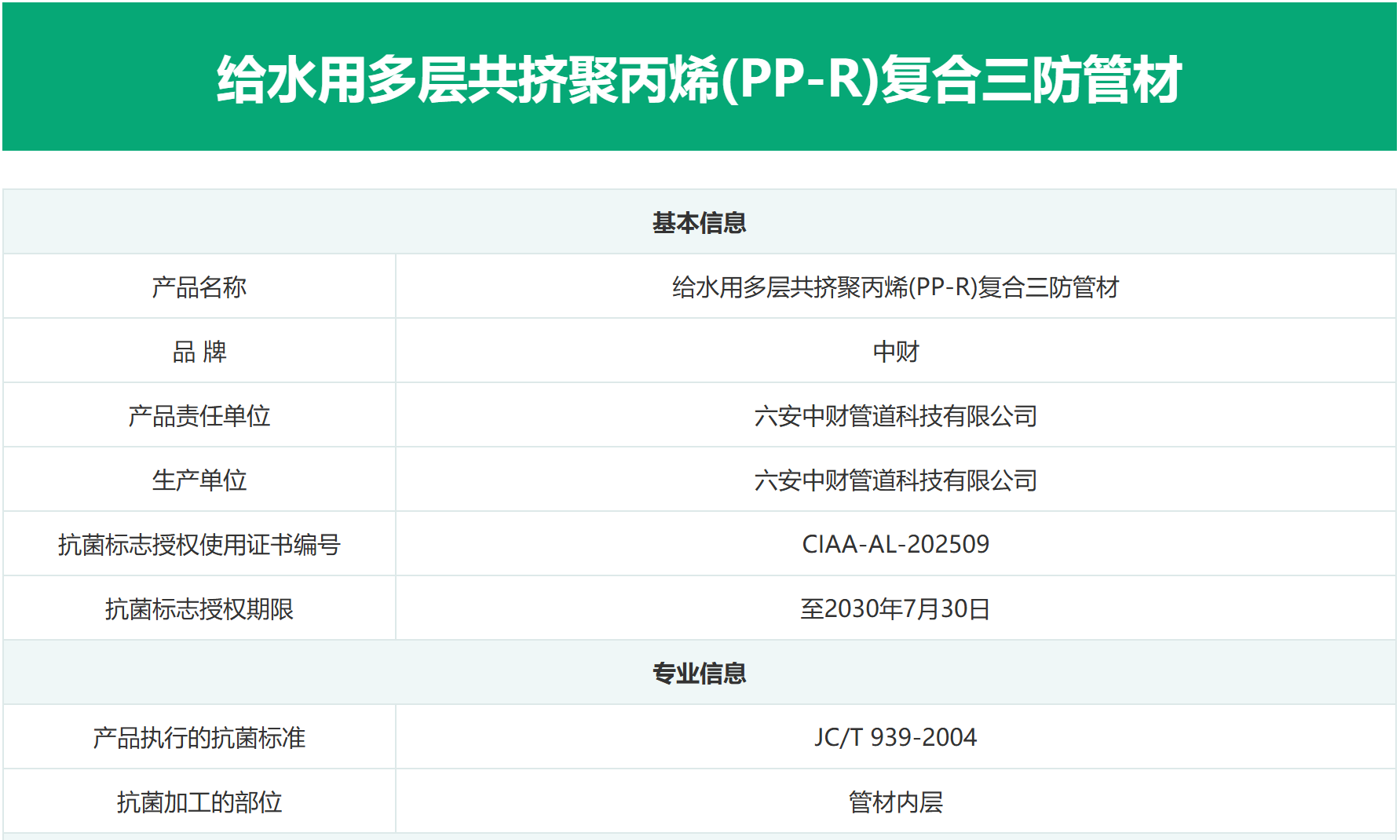 日前,六安中財管道科技有限公司研發生產的給水用多層共擠聚丙烯(PP-R)復合三防管材通過CIAA的嚴苛審核,獲得抗菌標志使用授權。這意味著給